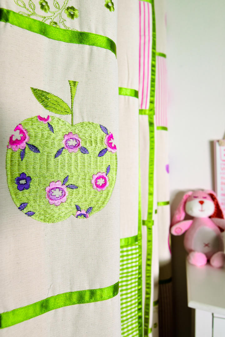 Over deze ondergrond zijn de motieven met borduurgaren aangebracht. Je ziet speelse vormen zoals hartjes, bloemetjes en fruit, die door hun stikwerk subtiel boven de stof liggen. Dat geeft het gordijn een duidelijke textiele beleving die je niet krijgt bij een gewone print. Tussen de geborduurde vlakken lopen glanzende satijnen biezen, die de stof in strakke vierkanten van ongeveer 20 bij 20 centimeter verdelen. Dat contrast tussen de matte katoenstructuur en de licht glimmende bies zorgt voor een levendig geheel dat in een meisjeskamer meteen in het oog springt.