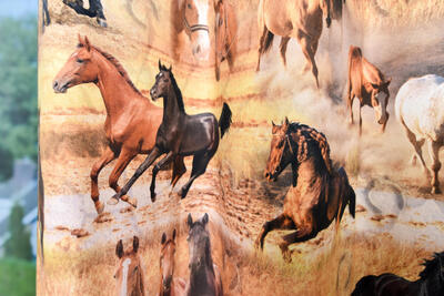 Een super gaaf paardengordijn voor de paardenliefhebber! De afbeeldingen lijken fotografisch echt op stof te zijn gedrukt. De glanzende vacht, wapperende manen en attente oortjes van deze edele dieren, komen allemaal haarscherp over. Daarom is dit gordijn best indrukwekkend en geschikt voor eenieder die de ruitersport een warm hart toedraagt. De krachtige energie spat er vanaf! De paarden zijn +/- 16 cm groot en afgebeeld op matte stof. Deze is aan de achterzijde wit, voor extra kleurbehoud van deze temperamentvolle dieren en verduistering, is voeren aan te bevelen.