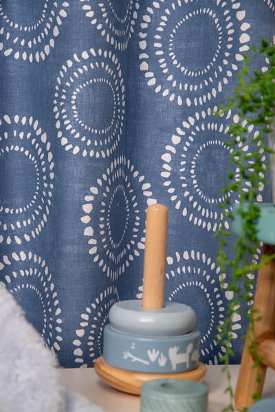 Breng een een stoer gordijn in de baby of kinderkamer met dit buitengewone Circling Dots gordijn. Dit prachtige gordijn is gemaakt van 100% katoen in een trendy denim kleur en is voorzien met een patroon van witte stippen die samen cirkels vormen.