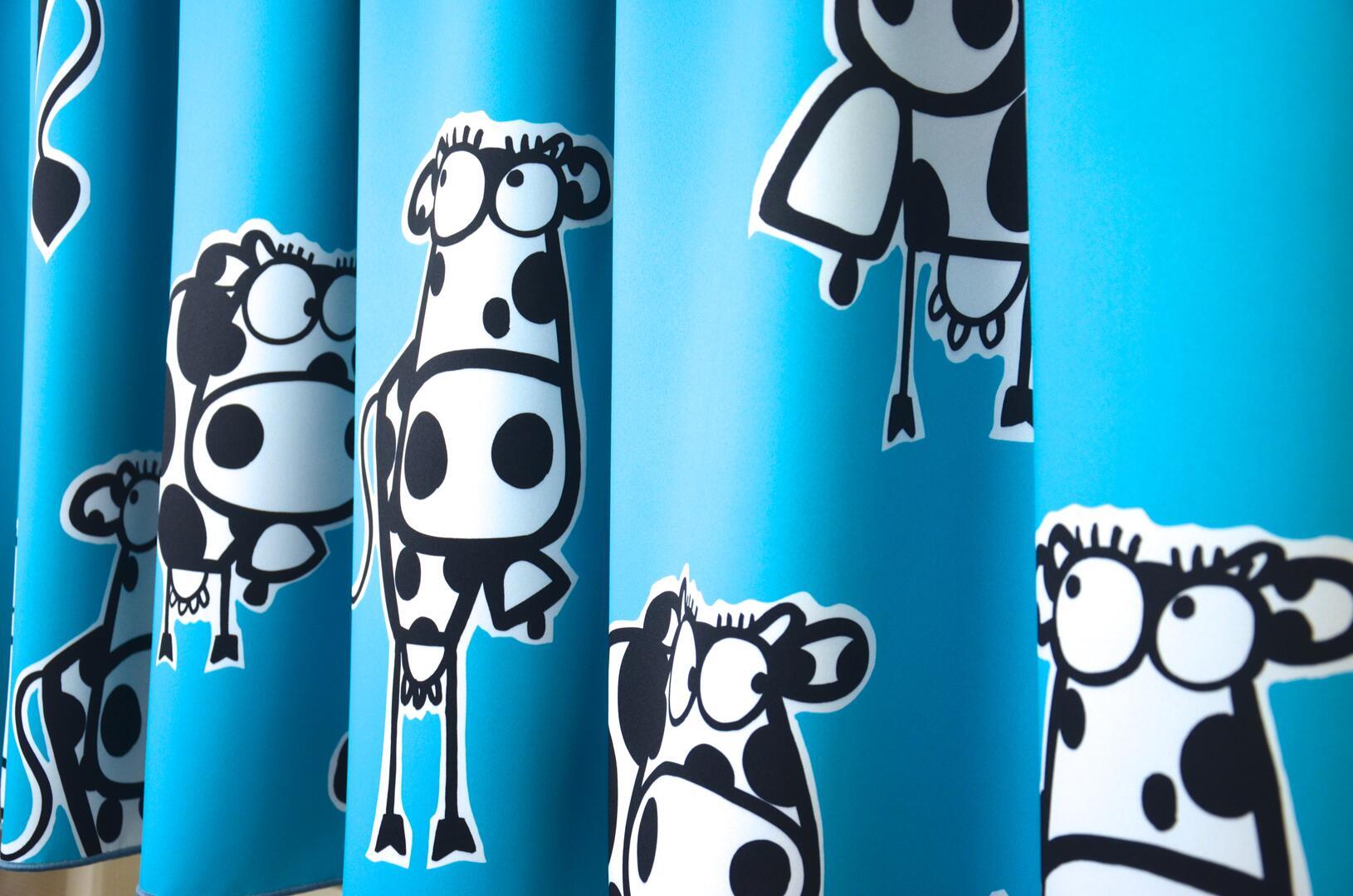 Deze gordijnstof met de naam Koe! (verduisterend) is gemaakt van de beste materialen waardoor het gordijn mooi in de plooi valt.