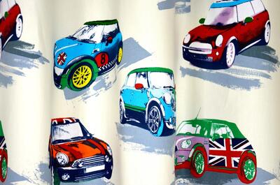 Katoenen overgordijn met Mini Cooper auto’s in de kleuren rood en blauw. Dit gordijn mag niet ontbreken in de kinderkamer van jonge autofanaten.
