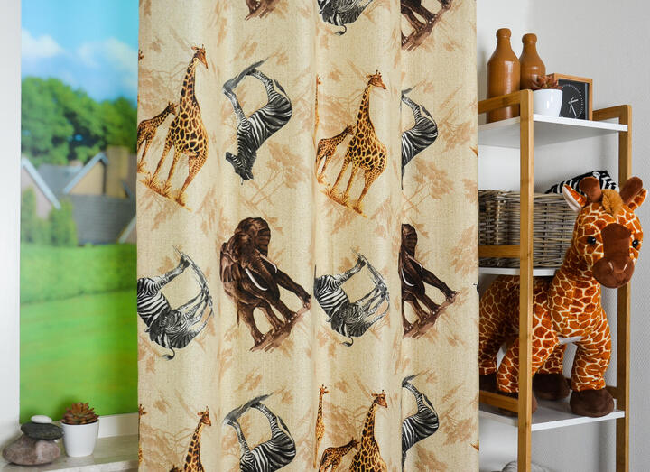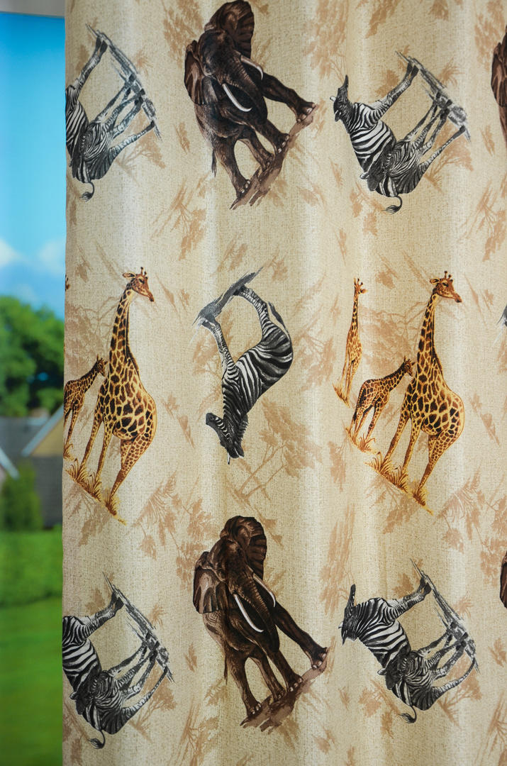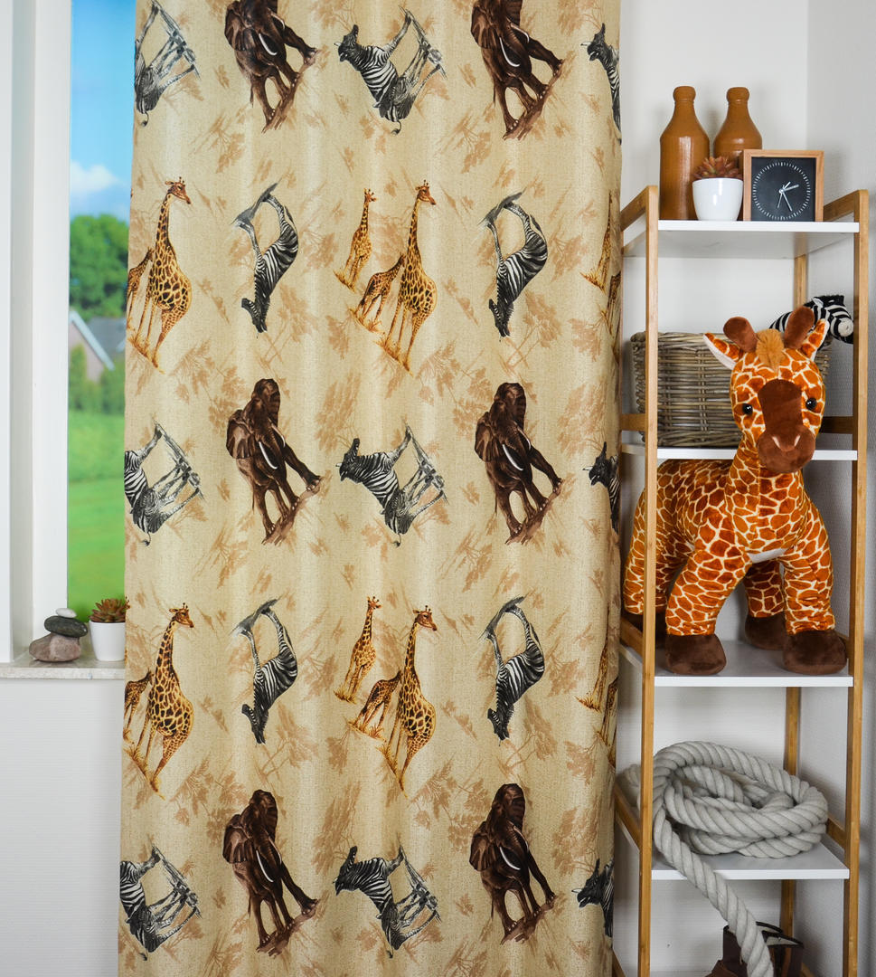 Een gordijn zó vanuit de Savanne! Rond de evenaar is het lekker warm en die gezellige warmte straalt dit gordijn ook uit. De camel kleurige ondergrond, is bedrukt met subtiele bomen en grassen op de achtergrond. Het patroon is royaal en stoer getekend, de olifant is wel 30 cm groot! Doordat de stof niet al te zwaar geweven is, kun je het patroon aan de achterzijde ook aardig zien. Wil je aangenaam donker slapen, dan kun je natuurlijk het Daktari gordijn laten voeren. Dan wordt de achtergrond egaal wit van kleur. Ga je mee op Safari?