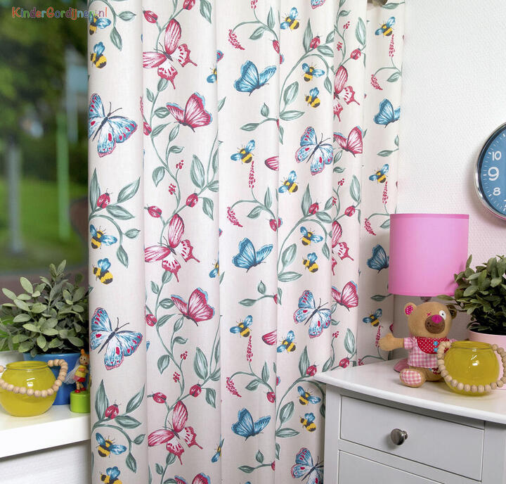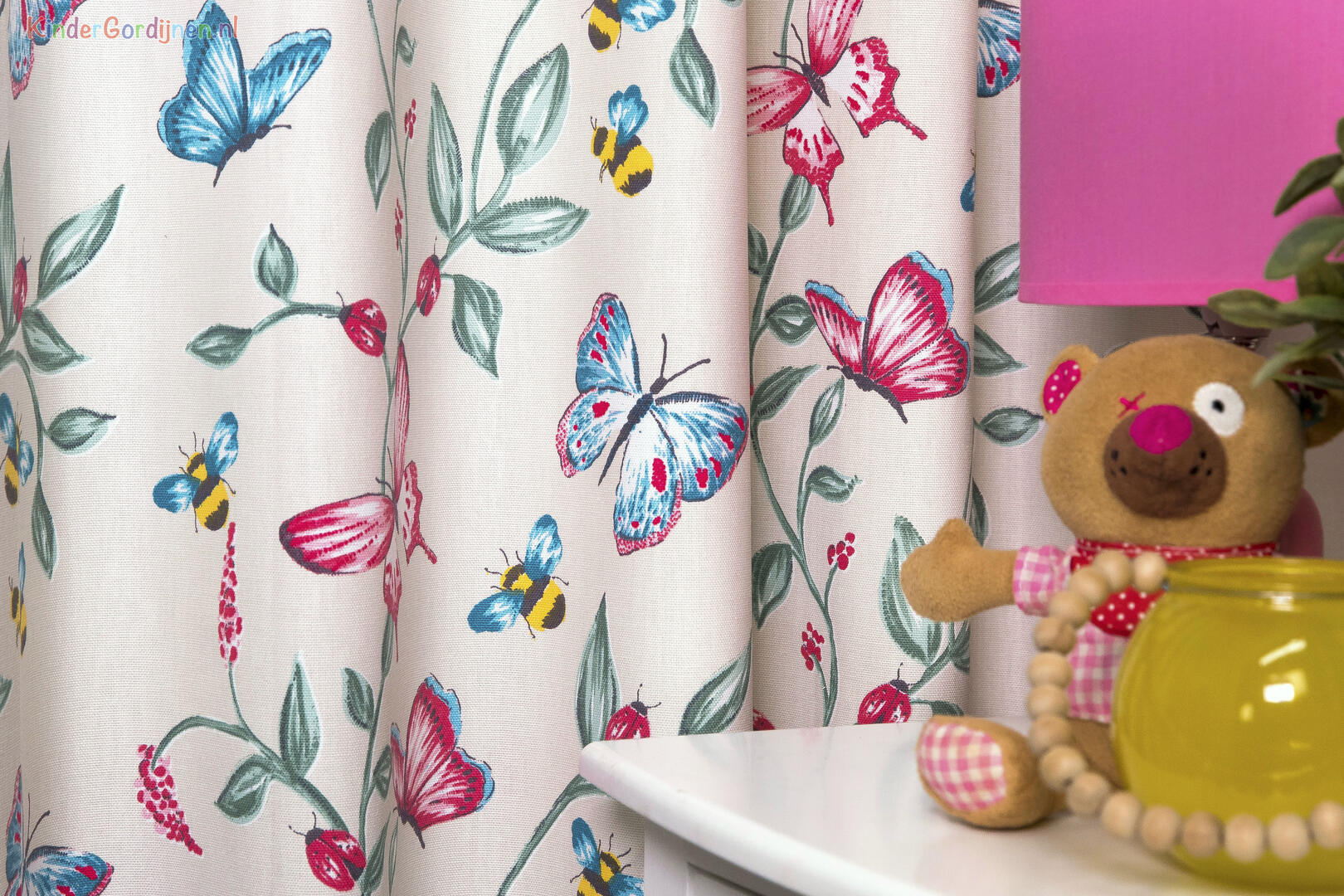 De vlinders en bijen fladderen en zoemen over de mooie iets wat matte katoenen gordijnstof.