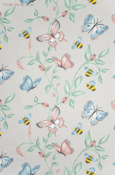 De vlinders en bijen fladderen en zoemen over de mooie iets wat matte katoenen gordijnstof.