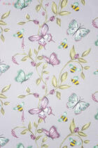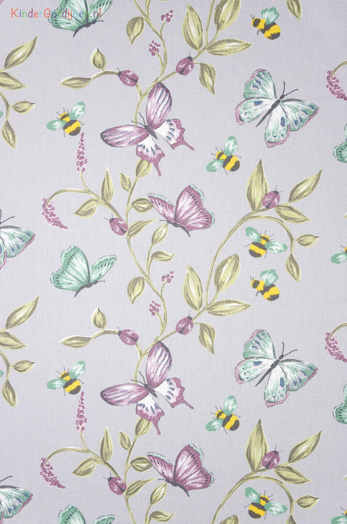 De vlinders en bijen fladderen en zoemen over de mooie iets wat matte katoenen gordijnstof.
