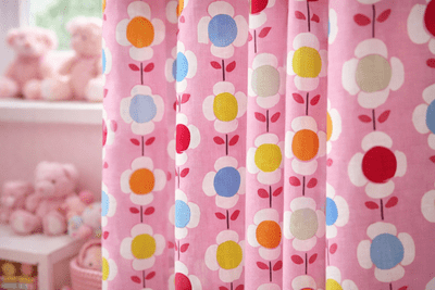 Het patroon is opgebouwd uit gelijkmatige rijen bloemen die mooi over de stof zijn verdeeld. Dit zorgt ervoor dat het gordijn ook wanneer het in plooien hangt zijn ritme behoudt. De bloemen ogen speels, maar door de herhaling blijft het geheel rustig en geschikt voor een slaapkamer waarin ontspanning belangrijk is. Het dessin voelt licht en vrolijk aan en sluit goed aan bij een zachte, gezellige kinderkamer.