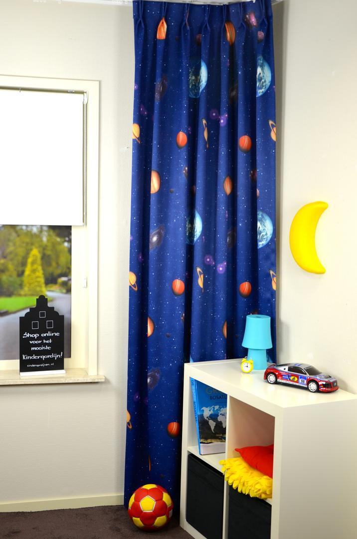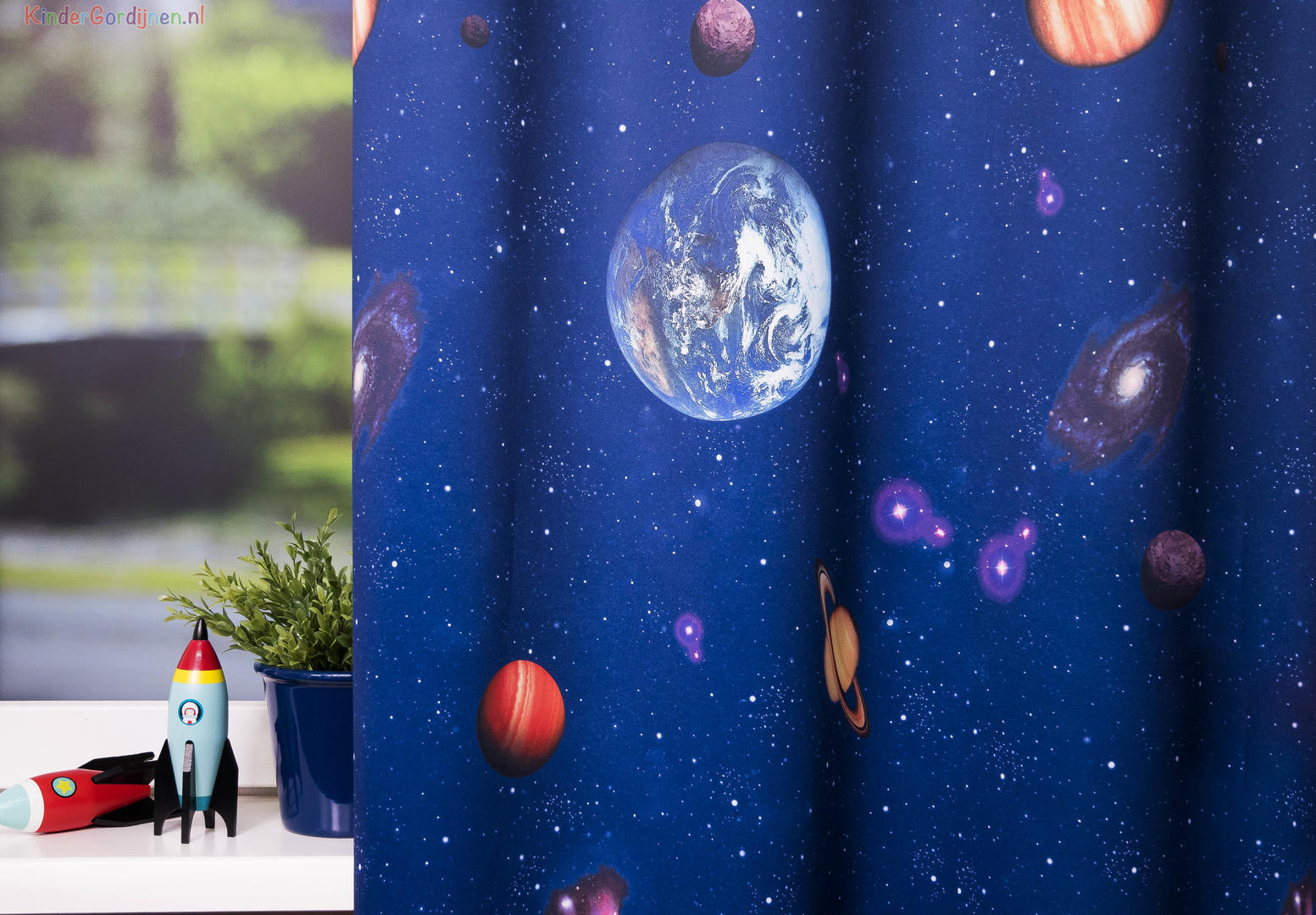 Met het Galaxy gordijn haal je een compleet sterrenstelsel in de slaapkamer. Deze prachtige gordijnen zijn geïnspireerd op de eindeloze ruimte: sterren, planeten en zonnestelsels staan op een donkerblauwe achtergrond gedrukt alsof je naar de echte nachtelijke hemel kijkt. De weergave van de planeten is levensecht en door de speciale, grafische druktechniek is elk detail haarscherp zichtbaar.