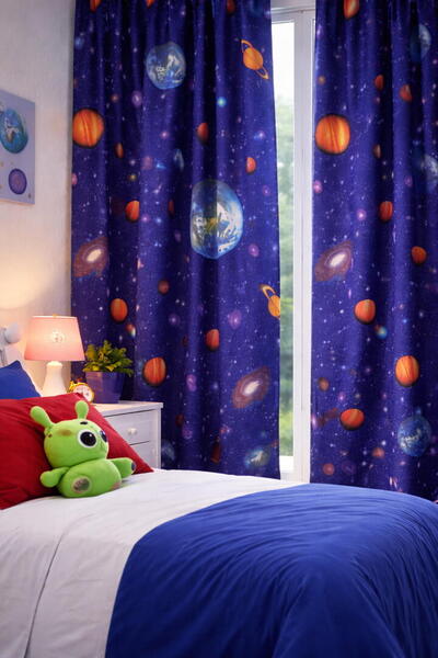 Is jouw kind een fan van ruimtevaart, sterrenkunde of droomt het ervan om astronaut te worden? Dan past dit gordijn perfect in zijn of haar kamer. Het thema spreekt tot de verbeelding: nieuwsgierige kinderen zullen steeds weer nieuwe details ontdekken in het patroon van sterren en planeten.
