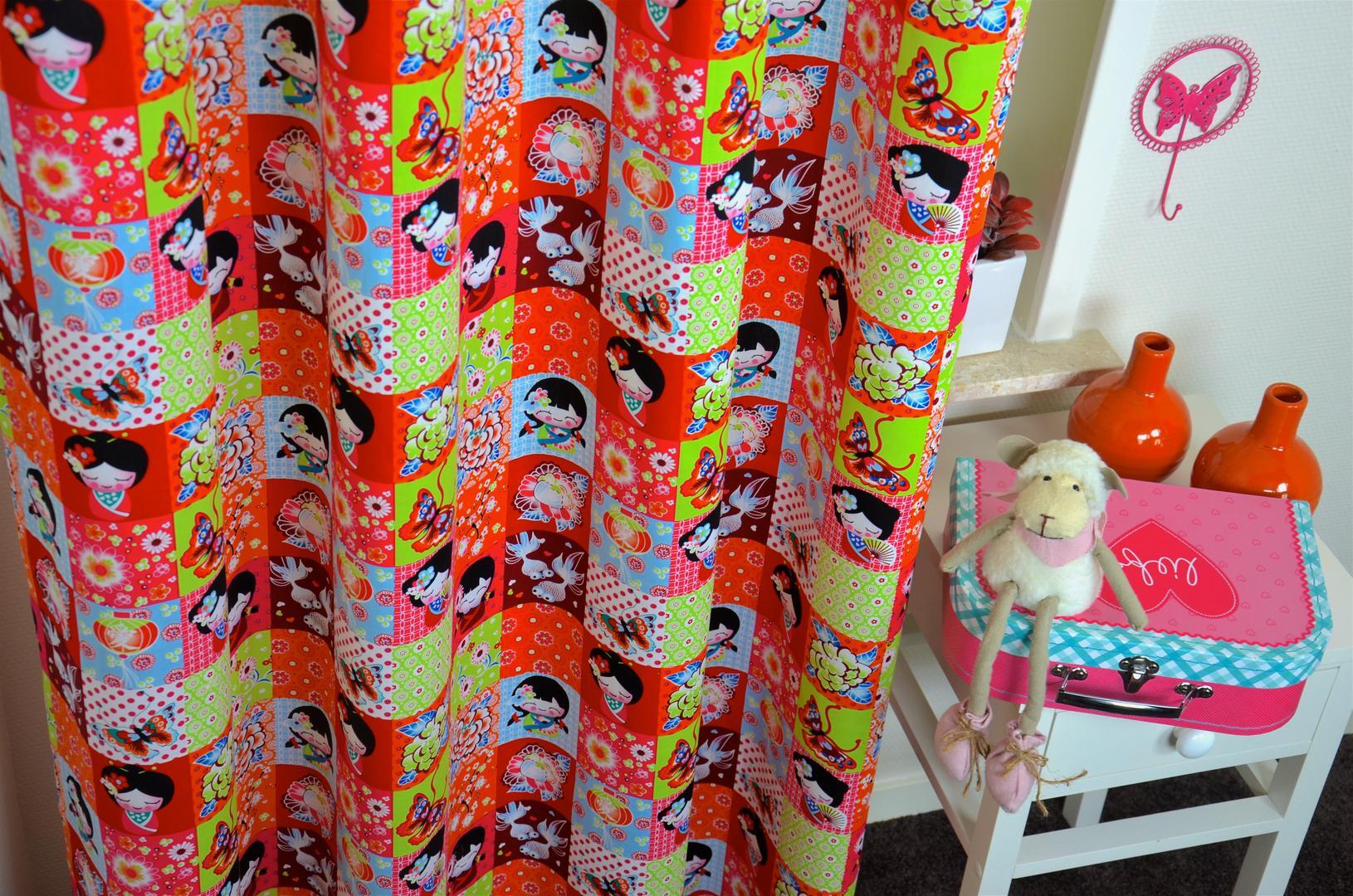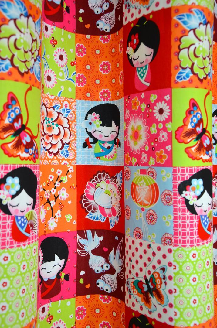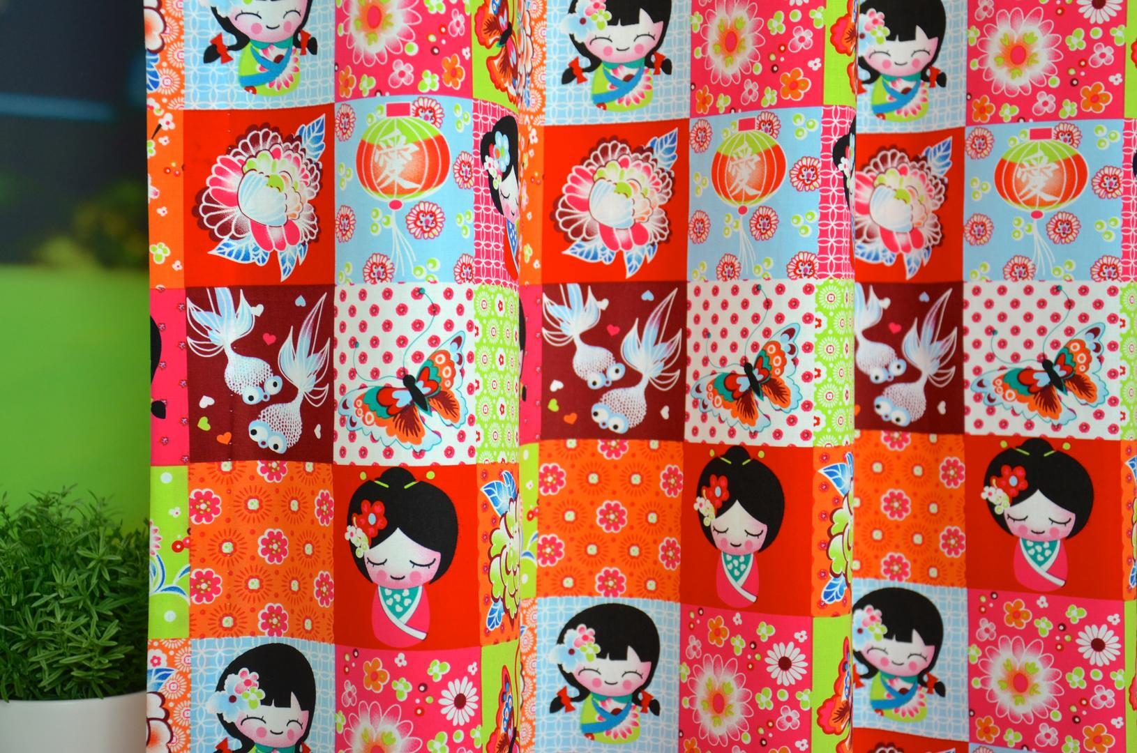 Kleurrijke meisjesgordijnen met een knipoog naar het sprookjesachtige Japan. Het serene meisje met waaier, de goudvisjes met sluierstaart en het klassieke Japanse lampionnetje. De afbeeldingen zijn gedrukt in vierkanten van 8 x 8 cm. Het thema kun je uitbreiden met bijpassende kussentjes of andere Japanse woonaccessoires. Maak van je slaapkamer een sprookje! Wie wil dat nu niet?