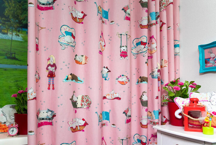 Het stylen van de kinderkamer is geweldig leuk om te doen en hoe bijzonder is het om een gordijn van een échte ontwerpster te hebben! Dit kindergordijn is gedrukt op pastel roze, matte en soepel vallende stof. De print is aan de voorzijde gedrukt en als je goed kijkt zie je die kenmerkende Hanneke details. Zij tekent hele mooie prinsessen boeken en hier zijn in dat genre verschillende, vertederende huisdieren afgebeeld. Tot de kleine, lieve kattenpootjes aan toe. Wil je ook nog lekker donker slapen, dan kan het gordijn verduisterend gevoerd worden. Kortom, wil jouw eigen prinsesje op een bijzondere manier naar dromenland? Geef je eigen knuffel dan een fantasierijk Hanneke de Jager kindergordijn!