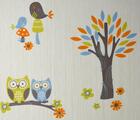 Deze kleurvariant heeft een iets meer natuurlijke uitstraling. Hier zijn de bladeren uitgevoerd in olijfgroen, lichtgroen, blauw en oranje, met opnieuw donkerbruine boomstammen. De uiltjes zijn limegroen en lichtblauw, en de vosjes blijven warm oranje, wat mooi afsteekt tegen de groenere tinten. Deze uitvoering voelt wat rustiger en iets minder zoet, waardoor hij ook uitstekend past in een stoerdere kinderkamer of een kamer die langer mee moet groeien.