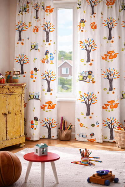 Het gordijn Forest van Esprit is een vrolijk en verhalend dessin dat kinderen elke dag opnieuw meeneemt in een eigen boswereld. In het motief zie je bomen met gekleurde bladeren, nieuwsgierige uiltjes op takken, speelse vosjes, paddenstoelen, bloemen en kleine vogeltjes. Alles is verspreid over een lichte ondergrond met een subtiele verticale structuur in de stof, waardoor het dessin niet druk oogt maar juist rustig en prettig blijft in een kinderkamer.