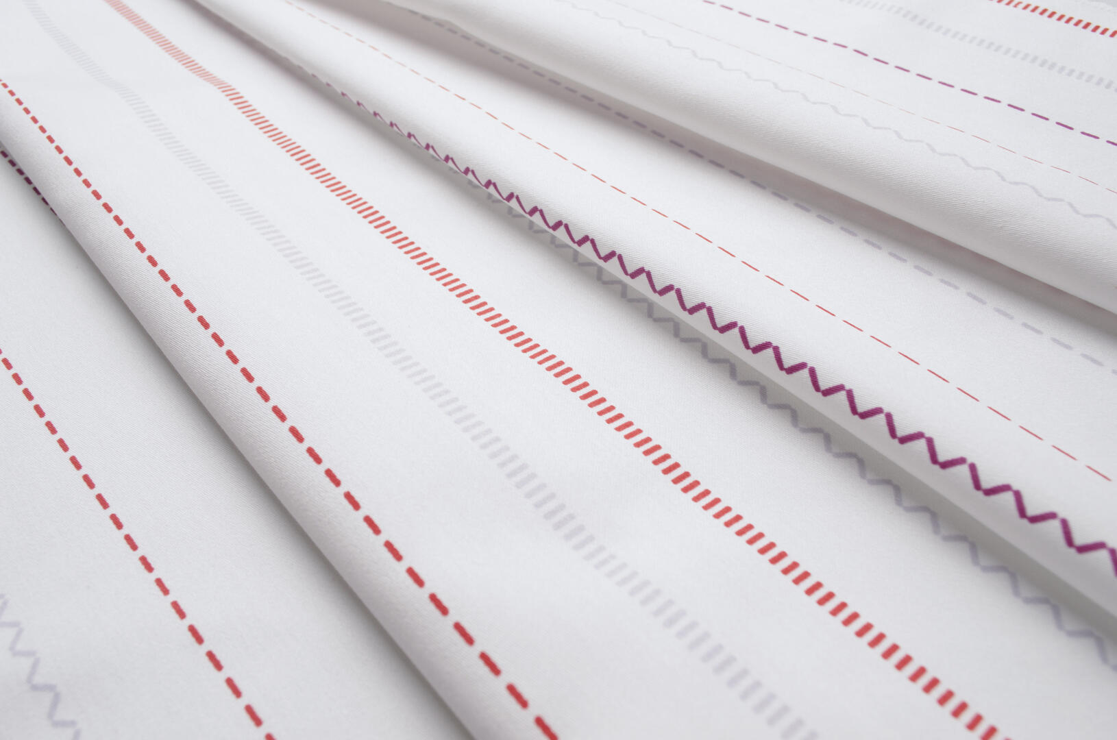 Het gordijn Dotted Line valt op door het ritmische streepmotief dat over de volle hoogte van de stof loopt. Het patroon bestaat uit een afwisseling van fijne stippenlijnen, korte rechthoekige streepjes en smalle zigzagbanen. Deze verschillende lijnsoorten zorgen samen voor een levendig maar overzichtelijk geheel. De verticale richting van het motief laat ramen hoger en slanker ogen, terwijl het zachte lijnenspel het geheel vriendelijk houdt.