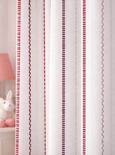De tweede uitvoering heeft een rustiger en iets krachtiger kleurenpalet van helder rood, diep bordeaux en zacht grijs. De rode en bordeaux strepen geven het gordijn warmte en diepte, terwijl de grijze lijnen voor balans zorgen. Ook hier ligt alles op een lichte ondergrond, waardoor het geheel niet zwaar wordt.
