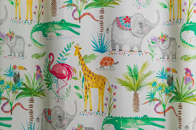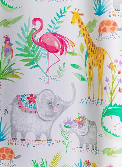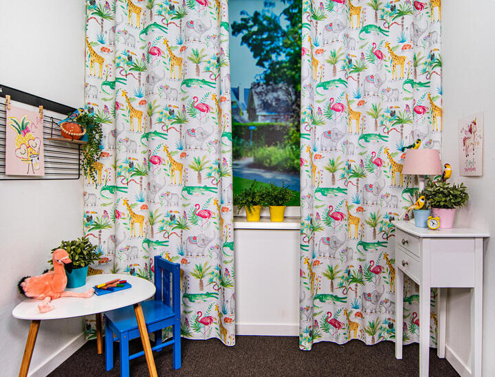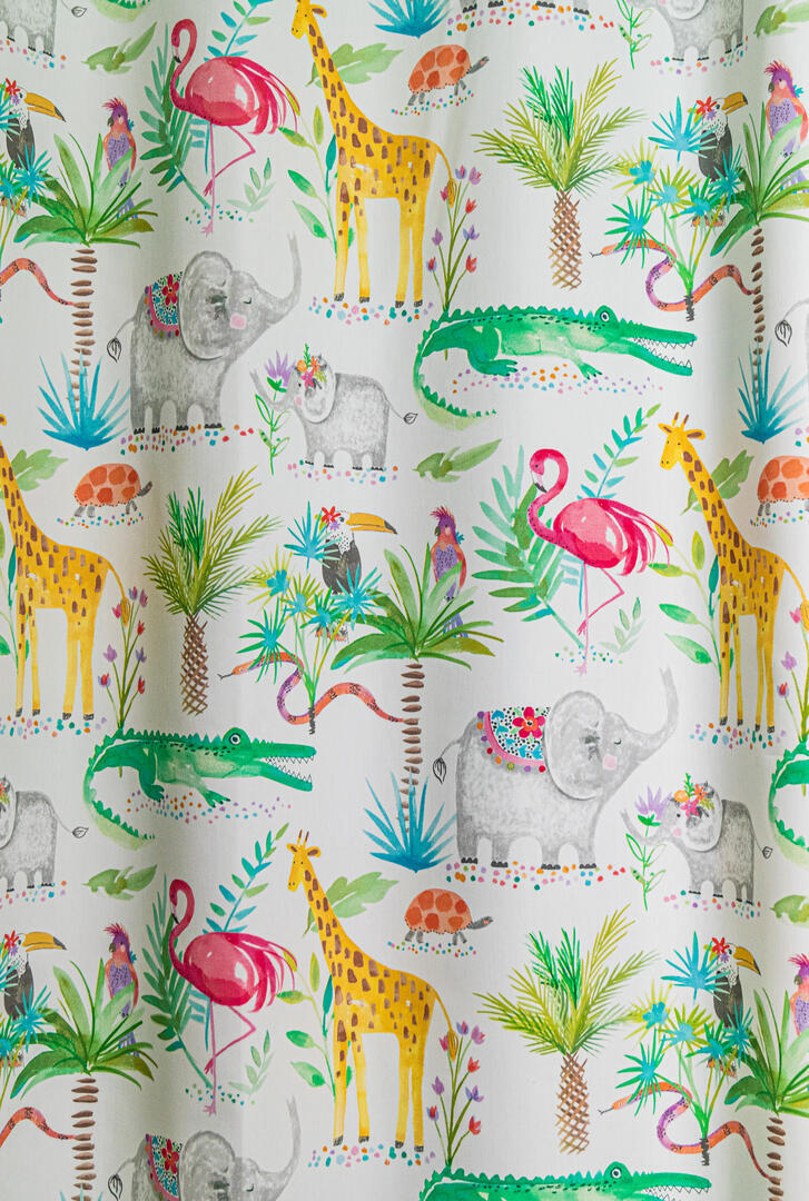Een prachtig gordijn voor je raam! Als jij je eigen gordijnen kiest, wordt het helemaal jouw kamer. Deze gordijnstof met de naam In the Zoo is gemaakt van de beste materialen waardoor het gordijn mooi in de plooi valt. Het aantal te gebruiken banen gordijnstof van 140 cm breed wordt door ons vakkundig aan elkaar geconfectioneerd zodat het jungle en safari patroon van 64 cm mooi doorloopt. Laat voor een aangename isolatie en extra verduistering de gordijnen voeren: een verschil van dag en nacht!