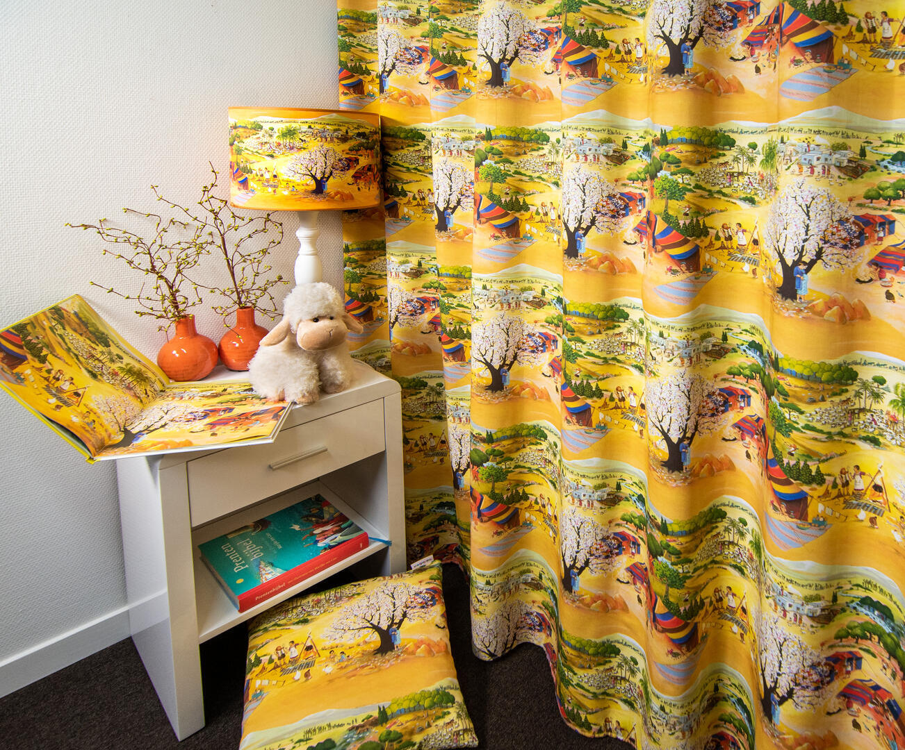 Marijke werkt al twintig jaar illustrator voor verschillende bekende uitgevers. De stoffen die uniek ontworpen zijn voor kindergordijnen zijn gebaseerd op de prentenbijbel, die door kinderen van over de hele wereld gewaardeerd wordt. Hij verscheen inmiddels al in 16 landen. Dat er na prentenboeken, kartonboekjes, puzzels en spellen nu ook stoffen zijn ontworpen bij deze bijbel is uniek. Marijke haar kleurrijke levendige stijl spreekt jonge kinderen erg aan. De personages lijken te leven en nemen je mee in hun wereld vol verhalen.