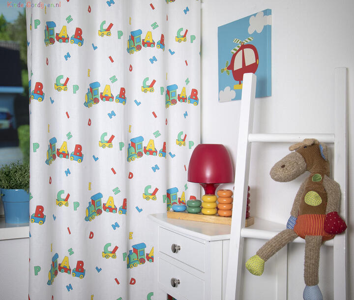 Deze gordijnstof met de naam Lettertrein is gemaakt van de beste materialen waardoor het gordijn mooi in de plooi valt.