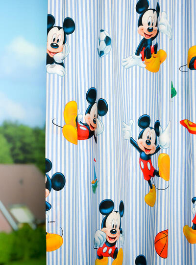 Katoenen kindergordijn van Mickey Mouse met prachtige blauwe tinten.
