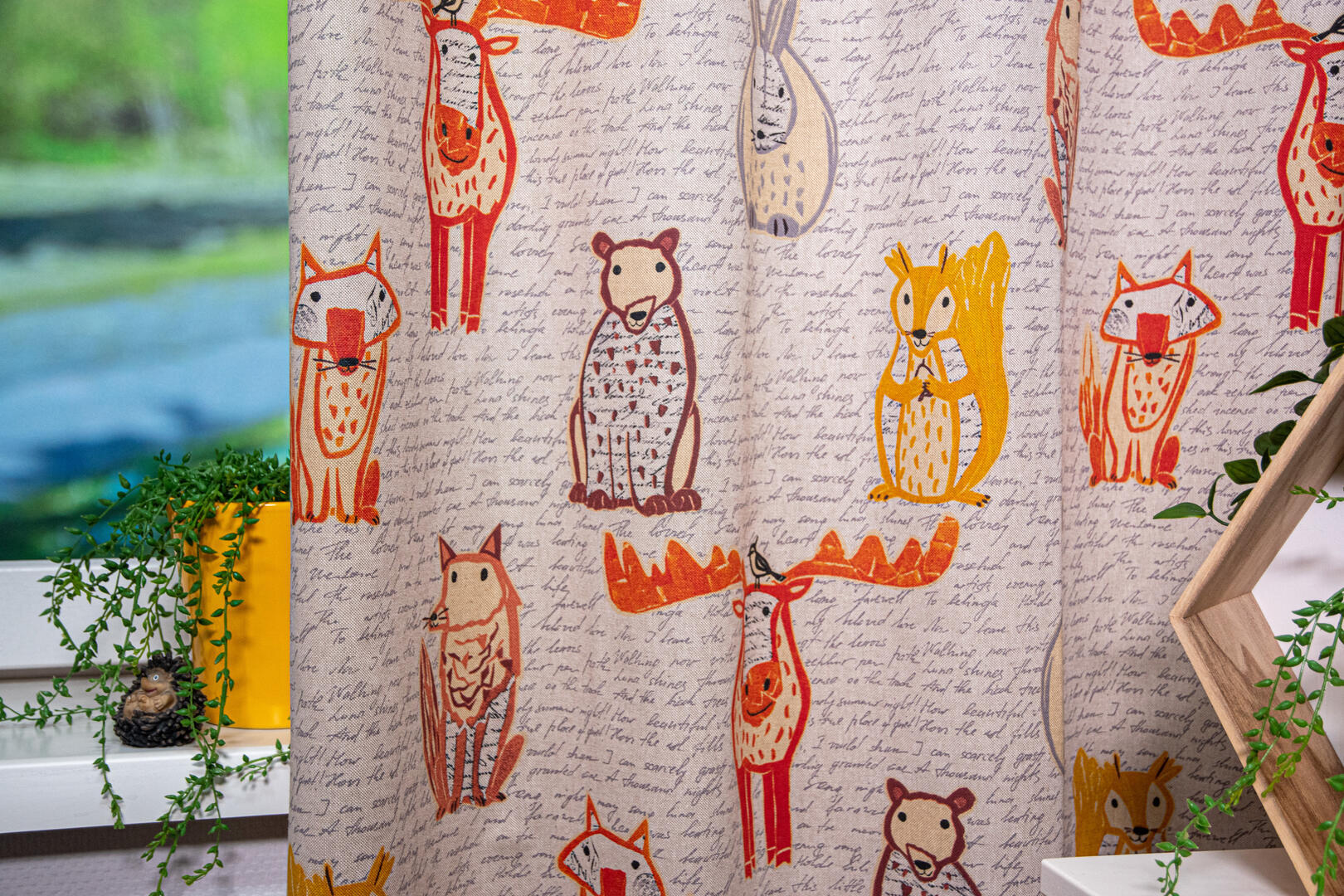 Deze gordijnstof met de naam Moose and friends is gemaakt van de beste materialen waardoor het gordijn mooi in de plooi valt.