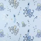 Het gordijn Octopus is een uitgesproken, handwerkrijke stof die meteen laat zien hoeveel aandacht en tijd erin is gestoken. Op een stevig, dicht geweven katoenen basisdoek in een zachte off-white tint zwemmen speelse octopussen door het vlak. De ondergrond heeft een subtiele rib en een licht matte uitstraling die doet denken aan canvas of fijn linnen, waardoor het borduurwerk er extra krachtig tegen afsteekt.