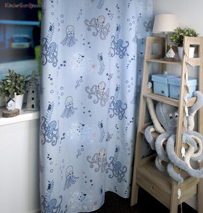 Elke octopus is met dik garen geborduurd en deels opgebouwd uit ingenaaide stukjes patchworkstof. In de foto’s zie je hoe sommige tentakels en koppen zijn ingevuld met ruitjes, streepjes en kleine printjes in blauwtinten, zandkleur, rood en wit. Die lapjes liggen iets hoger op de stof en geven het motief zichtbaar reliëf. Rondom de vormen lopen borduursteken die de dieren een getekende, bijna handgeschetste uitstraling geven. De octopussen hebben een formaat dat je meteen herkent op het gordijn en ze zijn verspreid over het vlak alsof ze rustig door het doek bewegen, afgewisseld met kleine nautische details die het geheel luchtig houden.