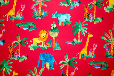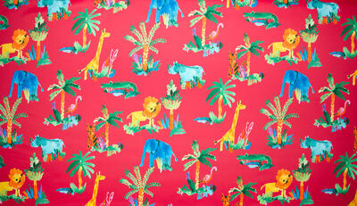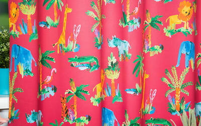Een verduisterend TOPPERTJE, dat is dit kindergordijn! Vrolijke dieren zijn afgebeeld op bijna 100% lichtdichte stof. De safari dieren zijn met een vlotte penseel techniek als het ware geschilderd op de gordijnstof. Dat geeft een speels effect. De flamingo is 8 cm groot, de palmboom zo’n 18 cm. De achterzijde van de stof is egaal gebroken wit. Zie jij dit kindergordijn al voor je? Er is zoveel leuks op te zien en voering is niet nodig!