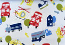 De tweede uitvoering heeft dezelfde speelse print, maar met iets zachtere kleurtonen. De voertuigen blijven duidelijk zichtbaar, maar ogen iets rustiger door het gebruik van iets gedemptere blauwen, grijzen en zachte groentinten. Het rood en geel blijven aanwezig, maar in een evenwichtig geheel dat goed combineert met verschillende kleuren op de muur of in het meubilair.