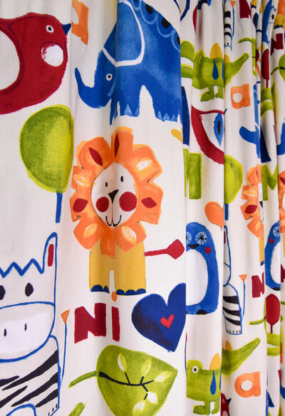 Savannen is een levendig kindergordijn waarin een speels dierenrijk samenkomt op een rustige, natuurlijke ondergrond. Over de stof lopen vrolijke leeuwen met volle manen, nieuwsgierige giraffen, een gestreepte zebra, een vriendelijke olifant en een lange krokodil, afgewisseld met grafische bladeren, wieltjes en speelse letters. Het patroon heeft een handgeschilderde uitstraling waarbij de vormen bewust iets ongelijk en zacht zijn gehouden, wat het geheel een warme en toegankelijke sfeer geeft die perfect past in een kinderkamer.