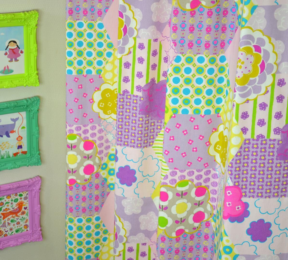 De kleuren zijn licht, vrolijk en zacht tegelijk. De basis bestaat uit pastelachtige tinten zoals lila, lichtroze, zacht paars en crème. Daarin zijn frisse accenten verwerkt in turquoise, zacht blauw, geel en lichtgroen. De bloemen en cirkels brengen extra diepte door het gebruik van meerdere tinten binnen één vorm. Deze combinatie maakt het gordijn geschikt voor zowel een babykamer als een meisjeskamer waarin warmte en kleur gewenst zijn.
