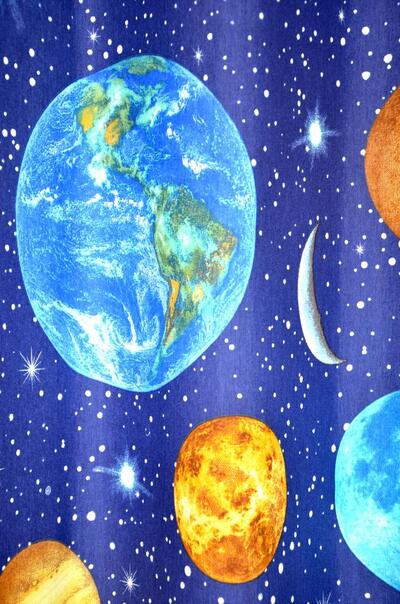 Het HEELAL op je slaapkamer, dat is pas slapen onder een sterrenhemel! Jupiter, Mars en onze planeet Aarde, hier 30 cm groot. De mooie zware bedrukte stof is kamerhoog en kan dus voor dezelfde prijs tot de grond gemaakt worden! De meterprijs is n.l. 280 cm hoog, zo komt ons zonnestelsel extra mooi uit op jouw slaapkamer. Voor extra verduistering kan het gordijn gevoerd worden.
