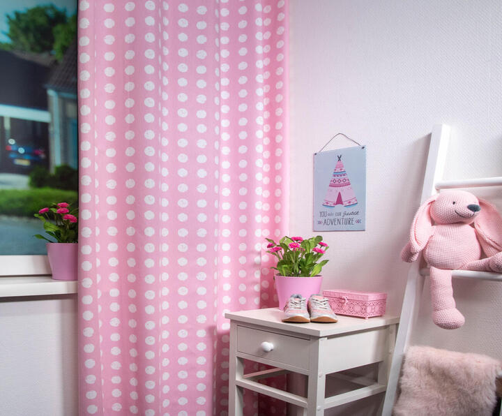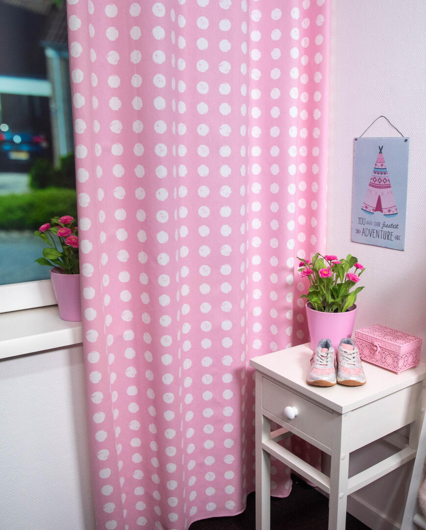 Het stippengordijn Zero is een hoogwaardige gordijnstof verkrijgbaar in 8 kleuren. Dit gordijn is gemaakt van een zware kwaliteit stof, waardoor het niet alleen een prachtige uitstraling heeft, maar ook duurzaam en stevig is. Wat dit gordijn zo bijzonder maakt, zijn de 3 cm grote witte stippen die als gestempeld lijken op de stof. Deze stippen zijn perfect geplaatst, netjes en eenvoudig in een rij op de stof. Het resultaat is een speels en trendy patroon dat een moderne touch geeft aan de kinderkamer.