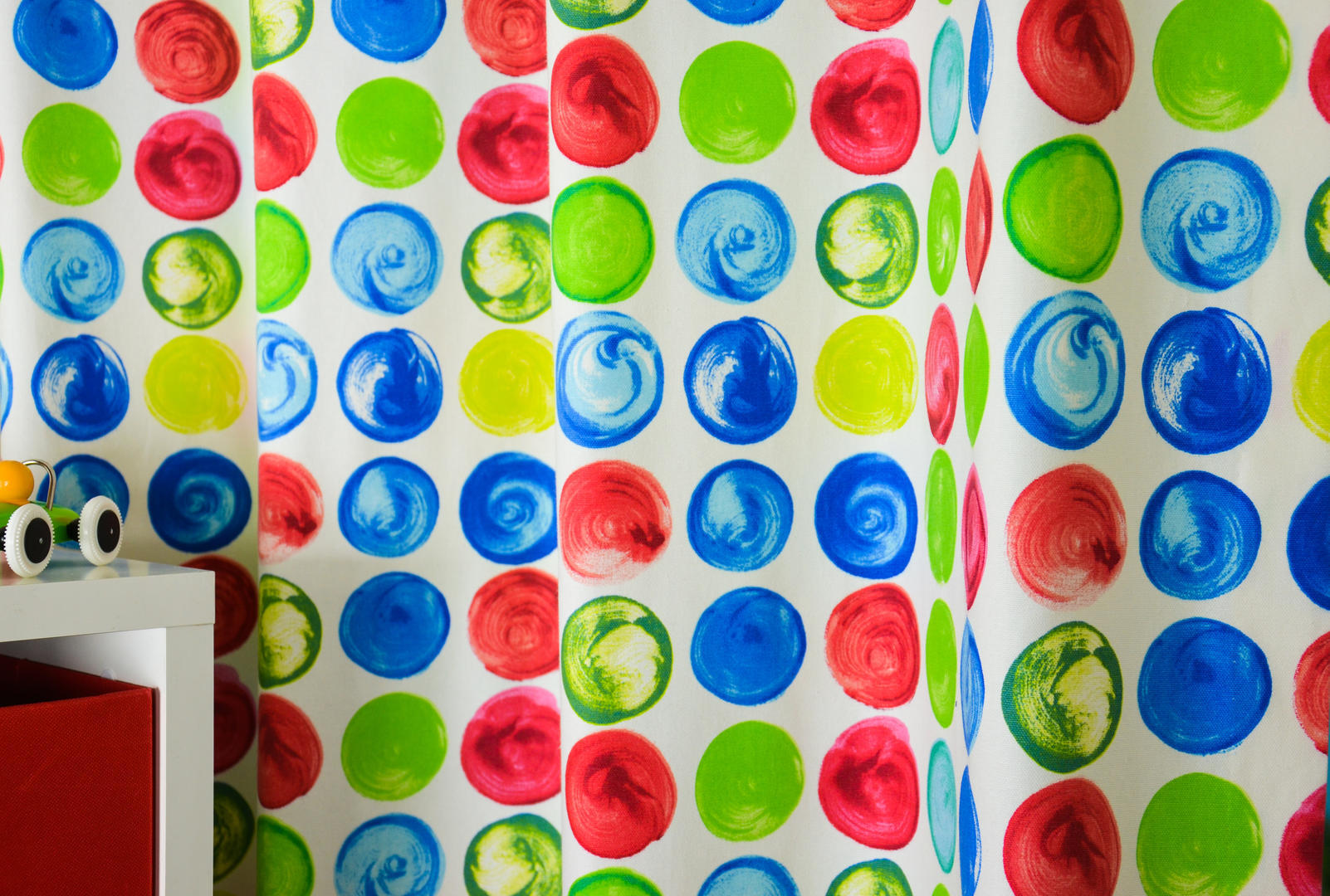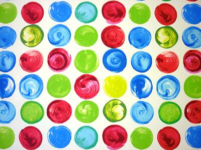 Vrolijke verfstippen op een warm witte ondergrond. Is het abstracte kunst of juist het schilderspalet? Beide stralen zonneschijn en creativiteit uit. De cirkels zijn 6 cm in doorsnede en het gordijn is leverbaar in 4 heldere kleurcombinaties. De stof is dicht geweven, voor verduistering evt. extra laten voeren. Alle kleurcombinaties zijn sprankelend en nodigen uit tot expressie.