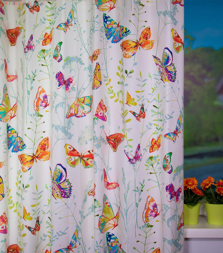 De digitaal bedrukte afbeeldingen zorgen ervoor dat de vlinders en bloemen tot in het kleinste detail tot leven komen. De levendige kleuren en speelse patronen maken dit een opvallend en vrolijk gordijn dat gegarandeerd de kamer van je kind zal verfraaien.