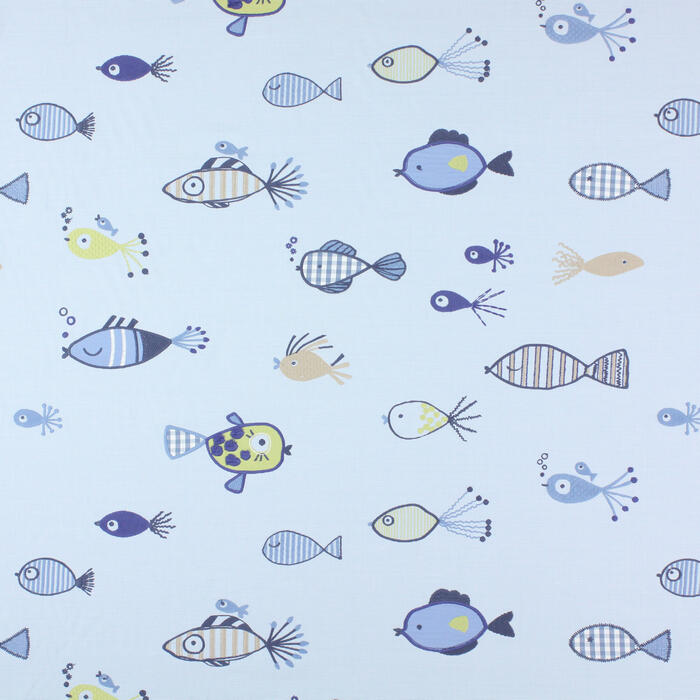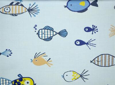 Het gordijn Tiddlers brengt een levendig zee-thema in huis met een patroon dat direct opvalt door de combinatie van borduurwerk en echte stukjes stof die in de figuren zijn verwerkt. Op de lichte, mat geweven katoenondergrond – met een zachte, iets geribde linnenstructuur – zwemmen vrolijke visjes, inktvisjes en andere zeediertjes in tinten blauw, rood, zand en crème. Sommige vissen hebben staarten van ruitjes- of streepstof, terwijl andere zijn gevuld met kleine lapjes die extra diepte geven. In de details zie je hoe zorgvuldig alles is opgebouwd: het grotere visje met de geborduurde schubben is afgewerkt met kleine, zachte kwastjes op zijn lijfje, wat het geheel een speels en bijna aaibaar karakter geeft.