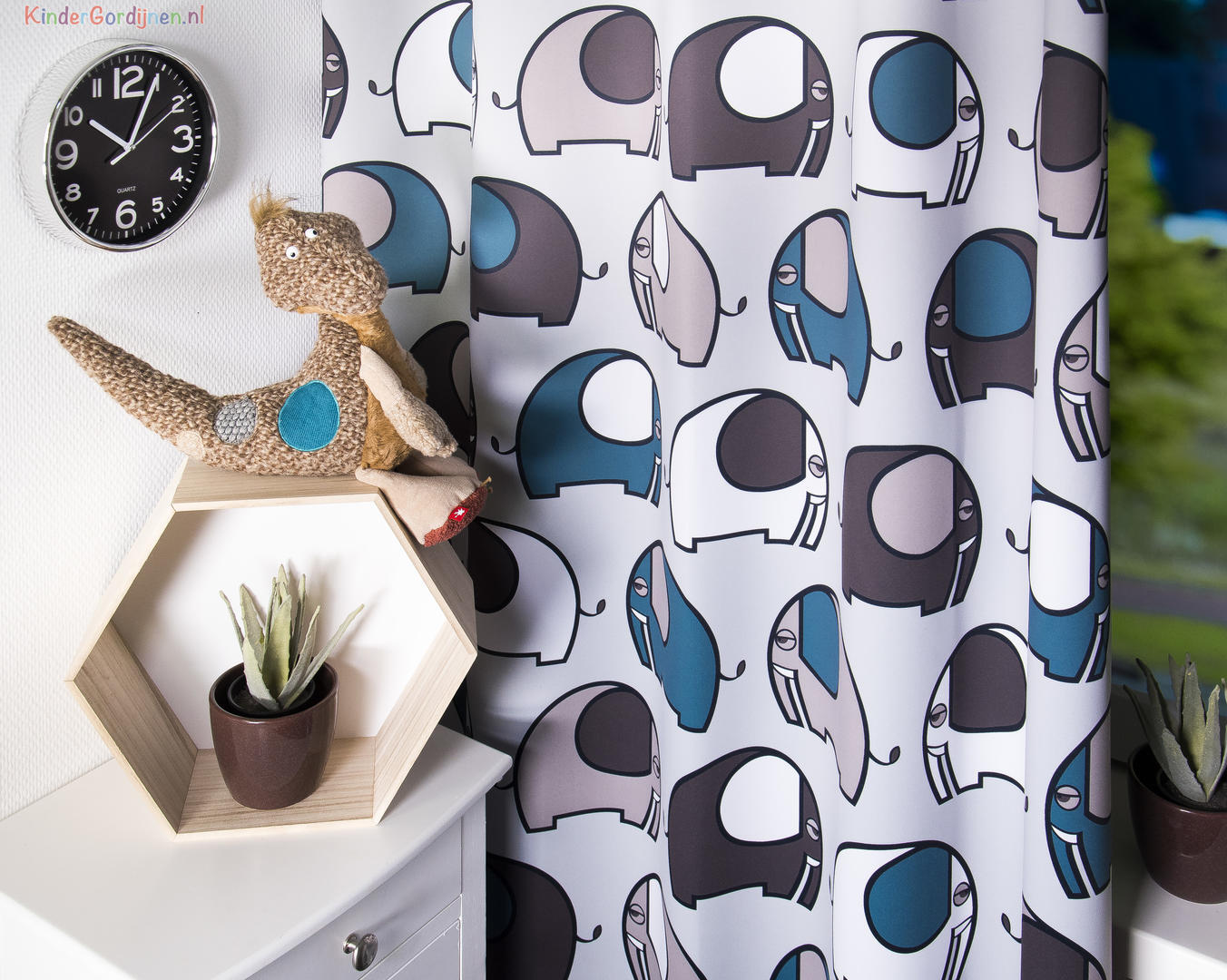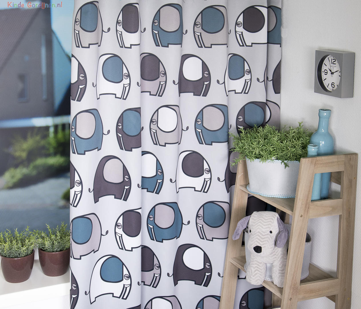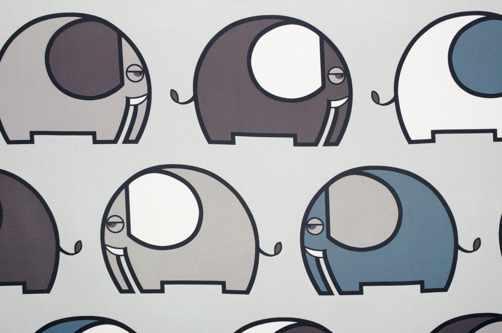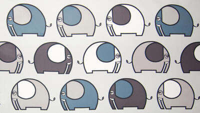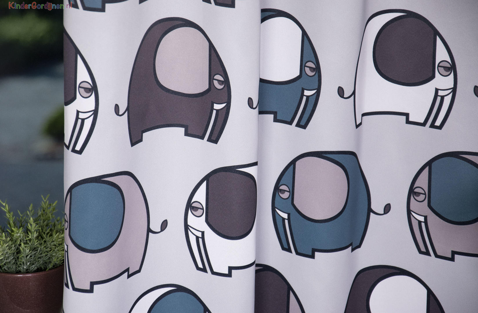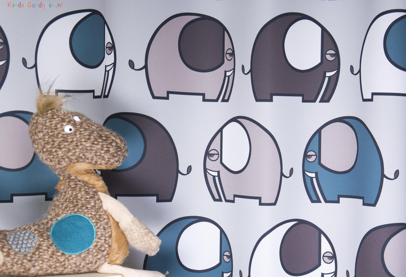 De basis van de stof is zacht grijs, waardoor de kleuren extra fris naar voren komen. Het motief bestaat uit een uitgebalanceerde combinatie van petrolblauw, grijsgroen, taupe en warm grijs, afgewisseld met witte vlakken. Deze tinten sluiten perfect aan bij moderne kinder- en babykamers, maar passen ook verrassend goed in een strak of Scandinavisch interieur. De dunne donkergrijze contourlijnen geven de olifanten een duidelijke vorm zonder hard te ogen.