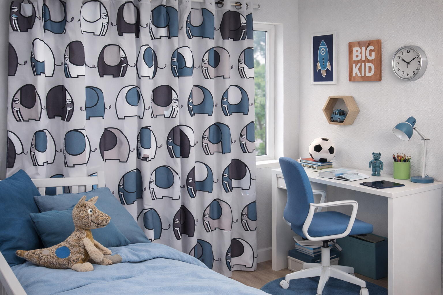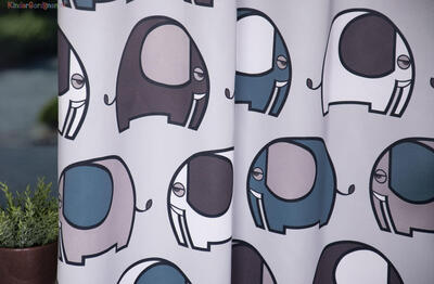Ronbo is een gordijn dat meteen in het oog springt door zijn vrolijke, grafische olifantenmotief. De figuren hebben een formaat van ongeveer 15 cm en zijn strak getekend met zachte afgeronde vormen, waardoor het dessin rustig blijft ondanks het levendige patroon. De olifanten staan in verschillende richtingen en kleuren, wat een dynamisch maar harmonieus geheel oplevert.