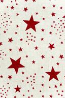 Fonkelende kamerhoge gordijnen met marineblauw of donkerrode sterren van verschillend formaat op een ietwat grijze ondergrond.