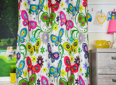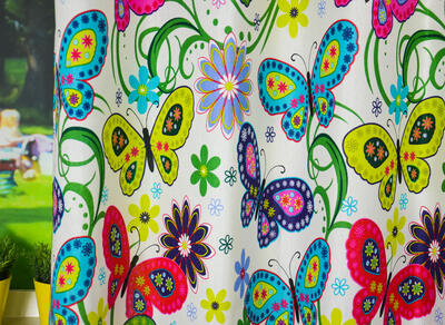 Vrolijke vlindergordijnen voor jouw slaapkamerraam! De afbeeldingen zijn gedrukt op sportieve, ietwat geribde stof. De ondergrondkleur is warm roomwit en het gordijn leverbaar in 3 verschillende kleurpaletten. Frisse zomerse tinten en de ander een wat ‘volwassener’ kleurgebruik. Ook goed te combineren met gebloemd behang. Welke past het beste bij jouw kamer? De stof is kamerhoog, dus voor hetzelfde geld mooi tot de grond geconfectioneerd! Voor een verduisterend effect even laten voeren.