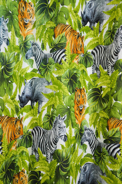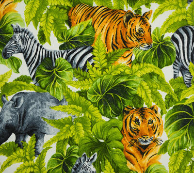 GRRR . TIJGERGORDIJNEN! En niet alleen tijger, want dierenprints zijn HOT! Zebra en neushoorn laten zich ook zien. Het patroon is gedrukt op matte, ietwat geribde stof. De tijger is 15 cm groot en kijkt uitdagend jouw kamer in. Durf jij het aan? De stof is voorradig, dus snelle levering gegarandeerd! Een extra kussen van deze stof maakt het thema natuurlijk compleet. Voor verduistering even laten voeren.