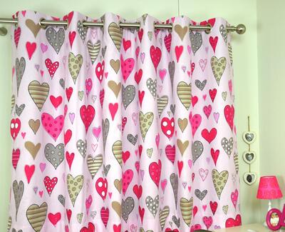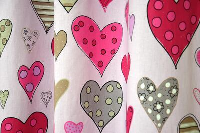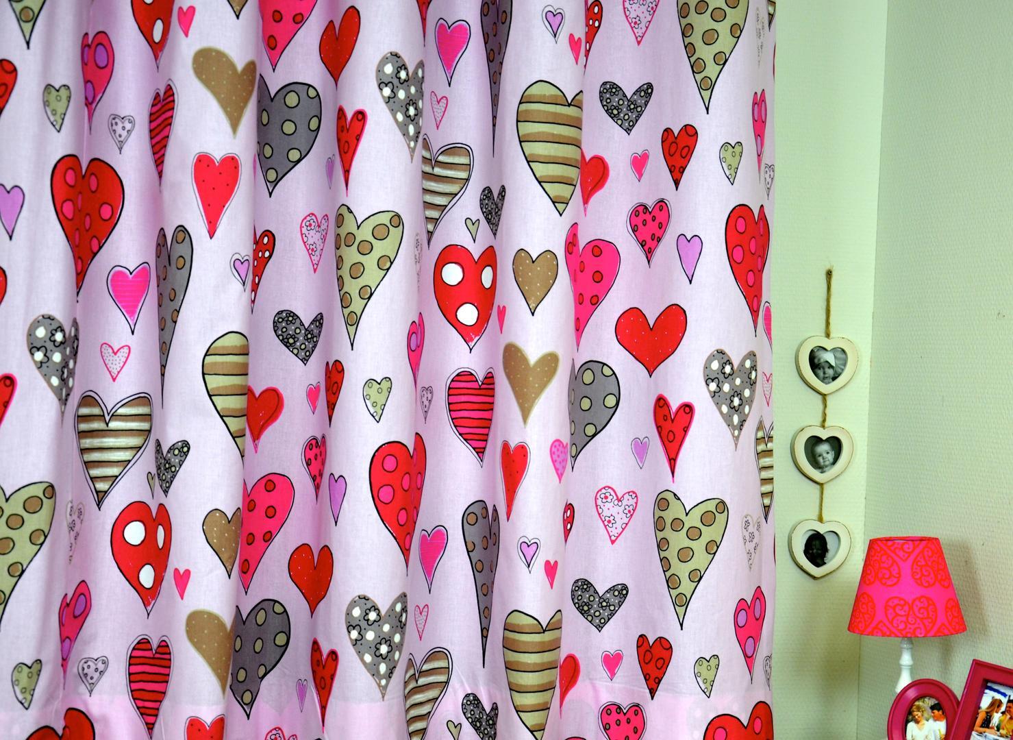 Kleurrijk hartjesgordijn met afwisselende motieven van strepen en stippen. Het Amor gordijn is beschikbaar in twee verschillende uitvoeringen en fleurt de meisjeskamer direct op.