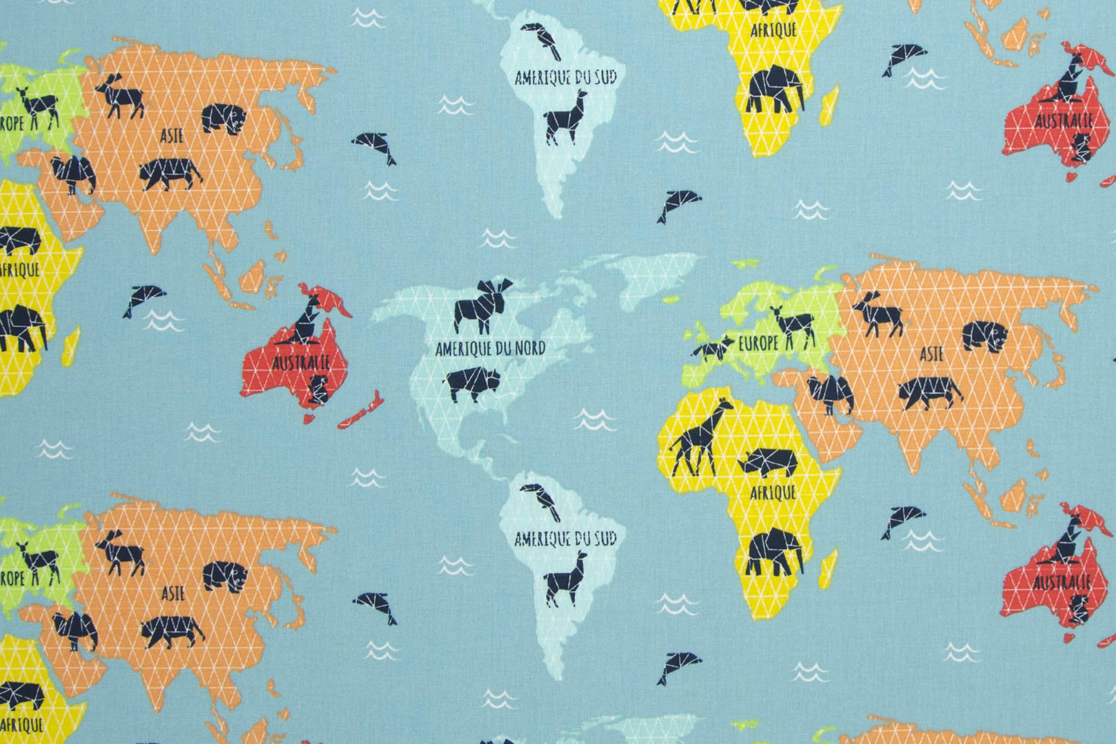 Een wereldkaartgordijn, hoe stoer is dat?! Op soepelvallende, matte katoenen stof is op de voorzijde de plattegrond van de wereld gedrukt. In zachte, rustige, vergrijsde tinten zie je duidelijk de landen en oceanen en hun ligging. Een ontzettend leuk & leerzaam gordijn want vanuit je bed kan je over verre reizen fantaseren. De stof is leverbaar in 2 kleurvariaties: een camelgrijze ondergrond of een lichte petrolkleurige ondergrond. Op de landen en werelddelen staan verschillende vrolijke dieren afgebeeld die je aan kunt treffen. Voor kleurbehoud van dit gave gordijn en eventueel verduistering, kun je de optie voeren aanvinken in het bestelproces. Word jij onze toekomstige globetrotter?