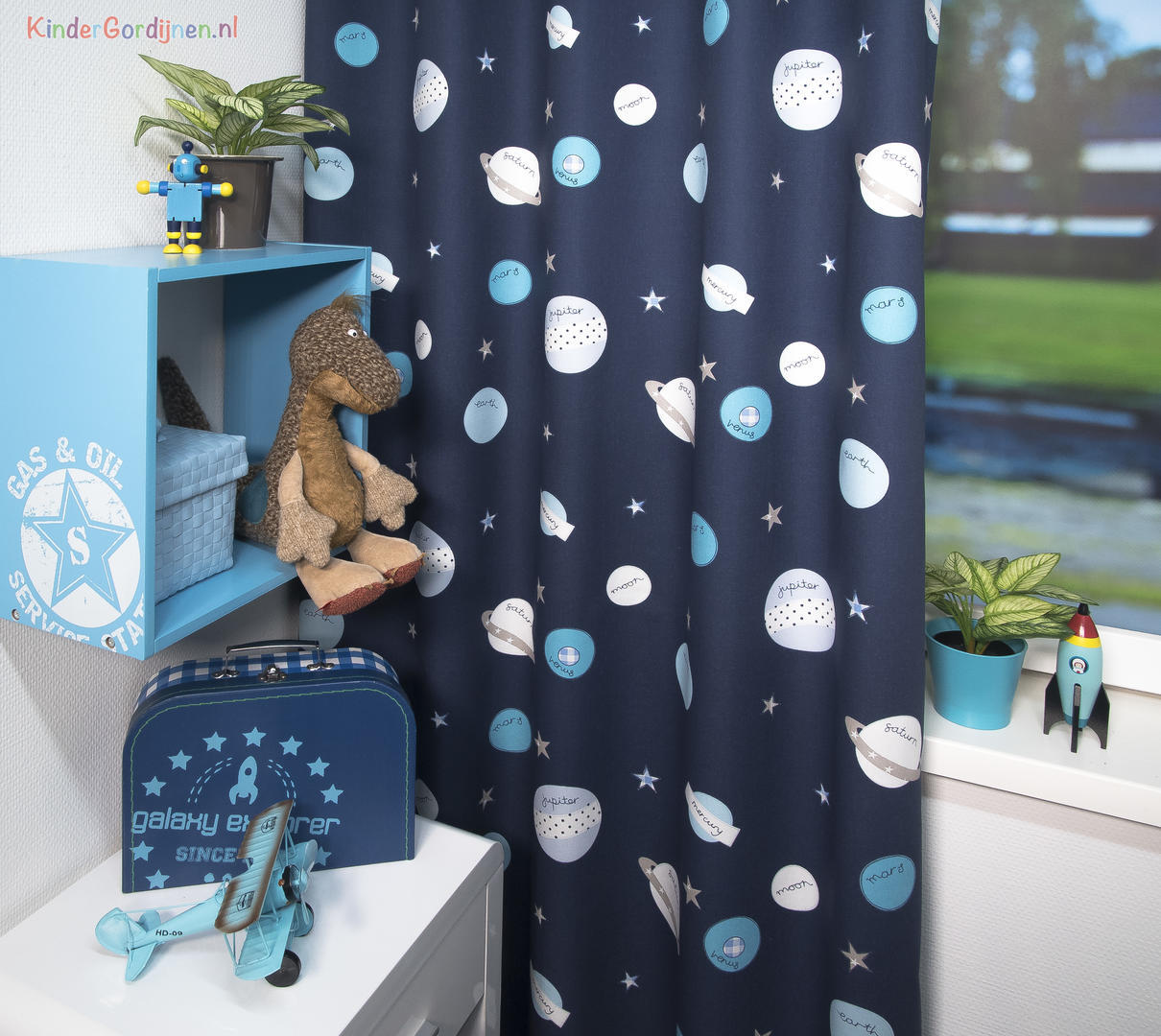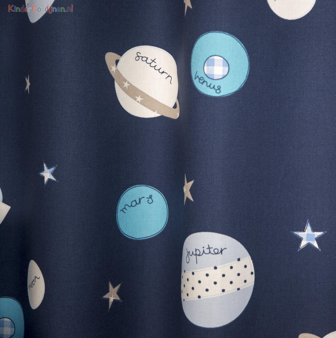 Het gordijn Space Mission brengt de wondere wereld van het heelal rechtstreeks de kinderkamer in. Op de dikke, donkerblauwe stof schitteren planeten in verschillende tinten lichtblauw en grijs, alsof ze zweven in de nachtelijke ruimte. Tussen de planeten fonkelen kleine witte sterren die het geheel een speels en ruimtelijk effect geven. Wat dit gordijn extra leuk maakt, zijn de namen die op de planeten staan: Jupiter, Mars, Venus, Saturnus en Moon – perfect voor kleine ruimtevaarders die alles willen weten over het zonnestelsel. De print is helder, fantasierijk en ideaal voor kinderen die dromen van raketten, astronauten en verre planeten. De stof is van uitstekende kwaliteit: stevig, soepel en prettig aanvoelend. Ze hangt mooi en blijft lang goed, zelfs bij dagelijks gebruik. De diepe blauwe kleur zorgt bovendien voor een rustgevend effect in de kamer, waardoor het gordijn niet alleen mooi is om naar te kijken, maar ook functioneel voor een fijne nachtrust. Tijdens het bestelproces kun je de optie “Voering” aanvinken voor extra isolatie en verduistering.