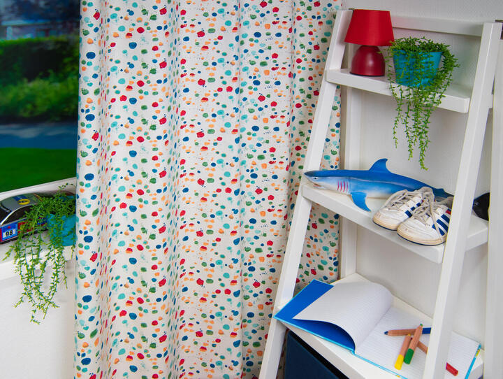 Ben je op zoek naar een tijdloos kindergordijn? Dan is dit dé goede keuze! Door de kleurrijke print is dit gordijn vrolijk en toch subtiel. De verschillende stippen lijken er als verfspatten op aangebracht te zijn. Uitstekend te combineren met een accentkleur op de muur of behang met patroon. Voor een jongen b.v. zacht oranje of jeansblauw, voor een meisjeskamer aquablauw of rood. Je kunt dit gordijn verduisterend en isolerend laten voeren of een rolgordijn kiezen. Dan kan je fijn donker slapen.