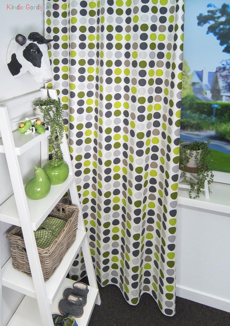 STIPPEN zijn HIP! En dit gordijn heeft royale stippen in frisse lime kleuren. De stip is 4,5 cm in doorsnede en is in wisselende groentinten op het doek aangebracht. Dat geeft een speels en kleurrijk effect. De ondergrond is een warm witte, dicht geweven stof, die desgewenst verduisterend gevoerd kan worden.