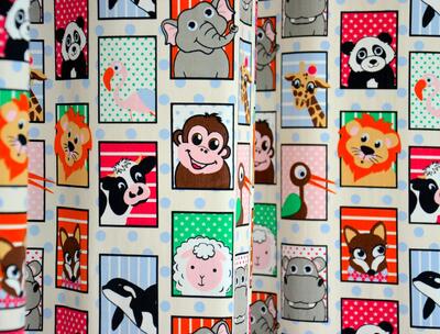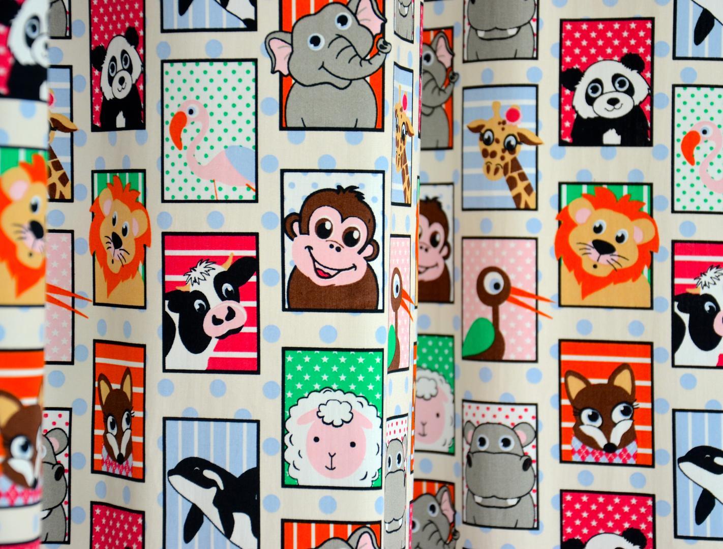 Echt een gordijn voor de dieren liefhebber! Hier zie je niet alleen SAFARI dieren, maar ook een diepzee orka en een onschuldig wit lammetje. Leverbaar in 2 verschillende kleurthema’s. Het ene gordijn heeft een crème wit met zachtblauw gestippelde ondergrond en de andere is lime groen met zachtblauw. Uitstekend geschikt voor de jongens- en meisjeskamer. De blokjes zijn 4 x 6 cm groot en gedrukt op gladde, matte stof. Wat is jouw lievelingsbeest? Desgewenst verduisterend voeren.
