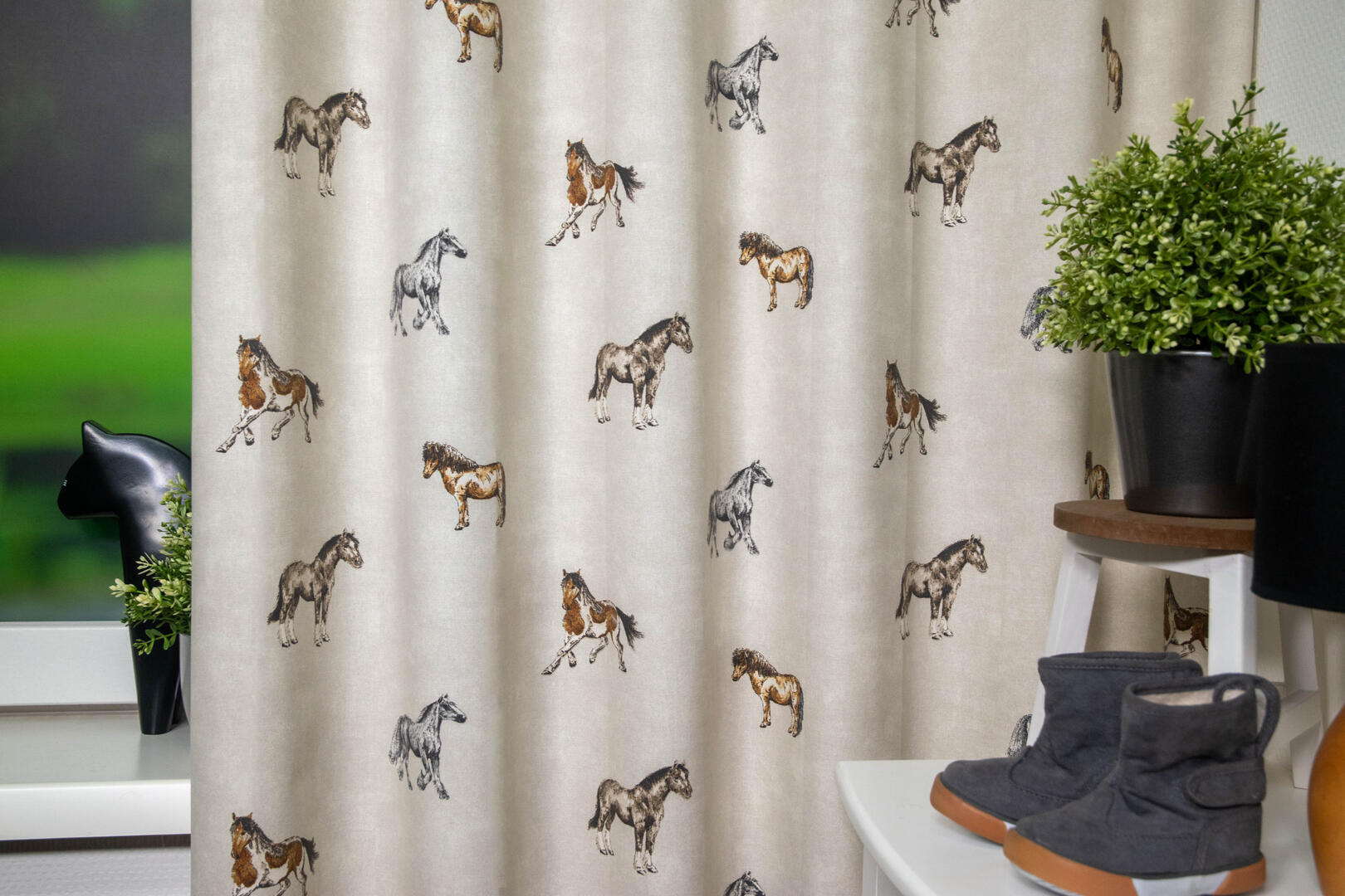 Het paardengordijn Stables! Op de ecru stof pronken verschillende paarden, sommige in galop en anderen in draf. De dikke maar soepele katoenen stof garandeert jarenlang plezier en duurzaamheid.