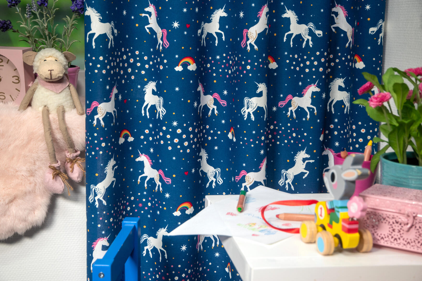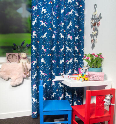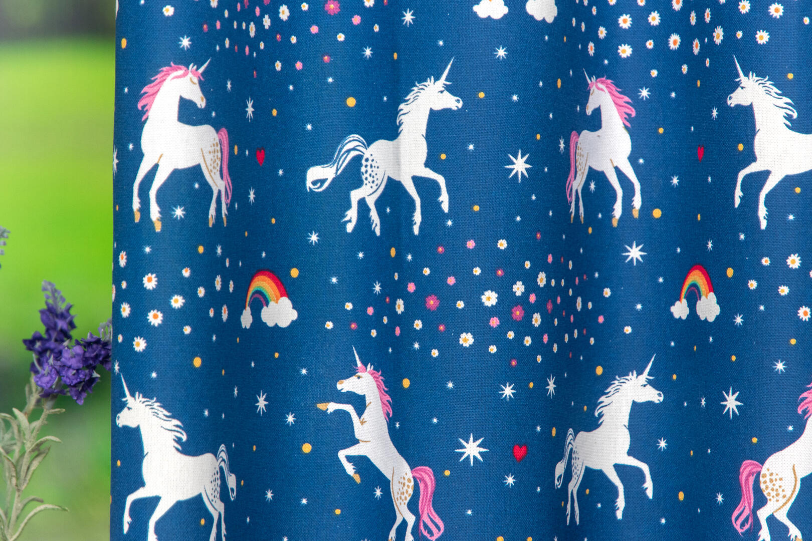 Niet alleen heeft het Starry Unicorn gordijn een betoverende print, maar het is ook gemaakt van dikke katoenen gordijnstof. Dit betekent dat het niet alleen mooi is om naar te kijken, maar ook duurzaam en van hoge kwaliteit is. Het gordijn voelt heerlijk aan en zorgt voor een gezellige en warme sfeer in de kamer.