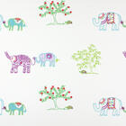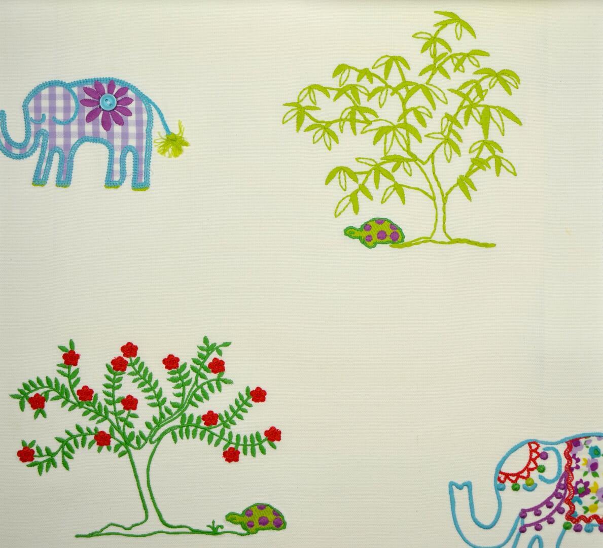 Tussen de olifanten staan sierlijke boompjes met rode besjes en fijne groene takjes, ook volledig geborduurd. Aan de voet ervan zie je kleine schildpadjes in bijpassende tinten, waardoor het patroon een verhalend geheel vormt. De kleuren zijn helder maar zacht gehouden: paars, turquoise, groen en rood steken mooi af tegen de lichte ondergrond zonder druk te worden. Dankzij die balans blijft het gordijn geschikt voor zowel een baby- als een peuterkamer.