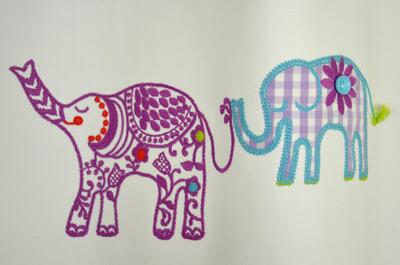 De olifanten zijn stuk voor stuk opgebouwd uit borduurwerk in combinatie met ingelegde printstofjes. Je ziet bijvoorbeeld paars-witte ruitjes, lila strepen en kleine bloemmotieven die netjes in het lijfje van de olifant zijn gezet en vervolgens rondom zijn vastgestikt met een iets dikker borduurgaren in turquoise of paars. Dit geeft een licht reliëf: de dieren liggen niet plat op de stof, maar komen een beetje omhoog. In sommige motieven is zelfs een klein knoopje in het ontwerp verwerkt, zoals bij de bloem op de olifant, wat een extra speels detail toevoegt en het handgemaakte karakter versterkt.