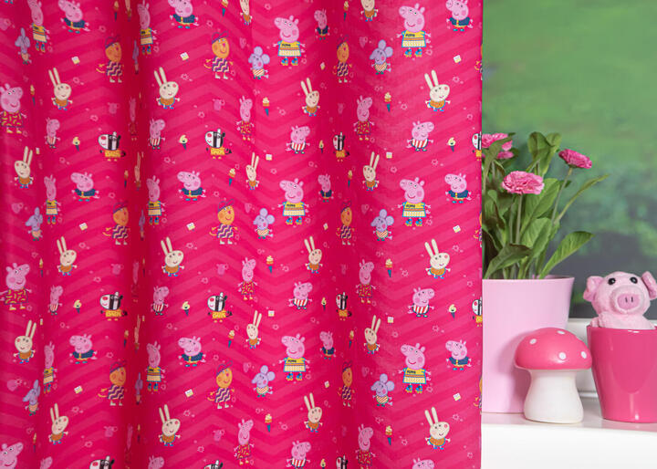 Deze gordijnstof met de naam Peppa Big is gemaakt van de beste materialen waardoor het gordijn mooi in de plooi valt.